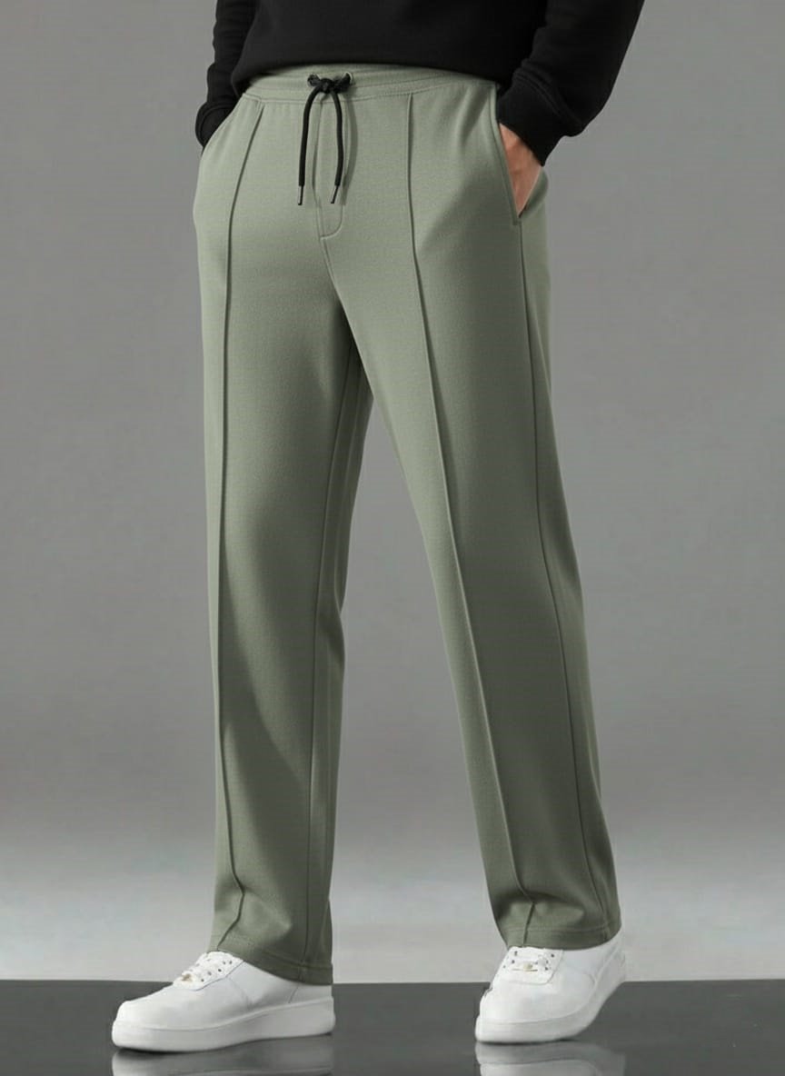Merging Lounge Comfort with High-Street Style. These Sage Green Trousers offer a supremely modern aesthetic. The relaxed, straight-leg fit is instantly elevated by the signature center pin-tuck seam that adds structure and a tailored feel. The popular Sage Green hue is versatile and sophisticated, making it easy to dress up or down. Finished with a sleek black drawstring, these trousers are perfect for achieving an effortless, clean, and on-trend look.