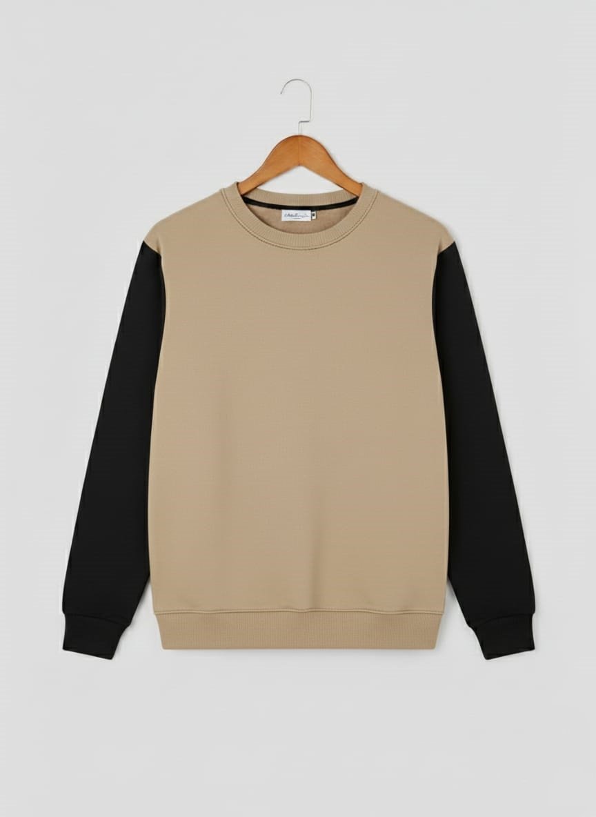 Modern Contrast, Timeless Comfort. Elevate your casual look with this stylish Khaki and Black Two-Tone Crewneck. The contrasting sleeves create a sharp, contemporary aesthetic that is perfect for street style and daily wear. Colors: Warm Khaki/Tan body with bold Black sleeves. Fabric: Soft, cozy Winter Fleece for reliable warmth. Design: Contrast colour blocking on the sleeves. The smart-casual essential. Shop this look today!